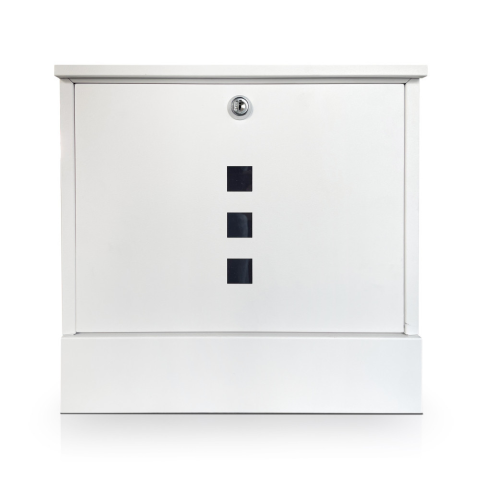 Ár-érték arányban az egyik legkedvezőbb modern formájú postaláda. 3 db lézervágott betekintőnyílással a küldemények könnyebb (a betekintőnyílás az ajtón belül víztiszta plexivel védett) vizuális észlelése érdekében. Reklám-, szórólaptartó a levélszekrény