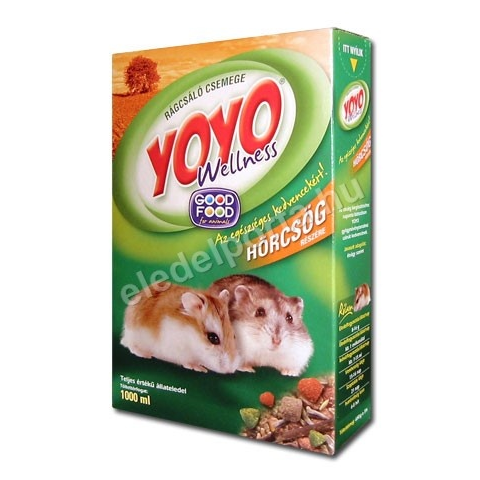 A hörcsög nem vegetáriánus, igényli az állati eredetű fehérjét is.Szeret enni, hasán keresztül is szelídíthető. Eledelét gabonafélékből, alacsony zsírtartalmú magokból, zöldségekből, gyümölcsökből, valamint állati fehérjéből ajánlatos összeállítani. A YOYO Wellnesseledel alapanyagainak minősége, összetétele, beltartalma biztosítja az egészséges, boldog és hosszú életet kedvencünk számára. A jóllakottság érzése mellett, kedvencünk nem hízik el. Figyelembe veszi az állat igényeit és faág hozzáadásával, állandó rágófelületet biztosítva, gondoskodik a fogak állagmegóvásáról.Összetétel: gabonafélék, magvak, lucerna, zöldség, gyümölcs, faág.