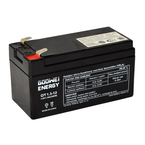 Szünetmentes akkumulátor - AGM technológia, F1 csatlakozó (4,7 mm), 500 töltési ciklus élettartam, akár 12 V feszültség, 1,3 Ah kapacitás GOOWEI ENERGY AGM OT1.3-12 F1, 12V, 1.3Ah szünetmentes táp akkumulátor jó szolgálatot tesz, hiszen időnként minden háztartásban szükség van újratölthető akkumulátorra. Ideális tartalék tápellátáshoz é