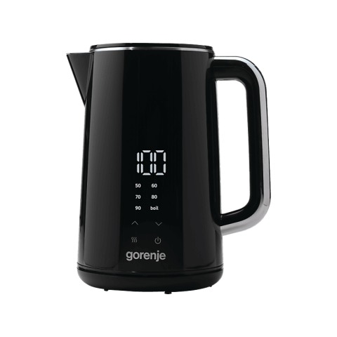 Vízforraló - hőmérséklet szabályozás, űrtartalma 1,7 l, fekete kivitel, 2200 W energiafogyasztás, bemeneti feszültség 230 V, érintéses vezérlés, duplafal, szűrő, strix csatlakozó, LCD kijelző és forgótalp, Anti-drip, automatikus kikapcsolás, működésjelző lámpa, víz nélküli működés elleni védelem, hőmérséklet megtartása, vízszint jelző, beépített szűrő, anyaga műanyag Ezen 1,7 lűrtartalommal rendelkező GORENJE Vízforraló könnyű és gyors italkés