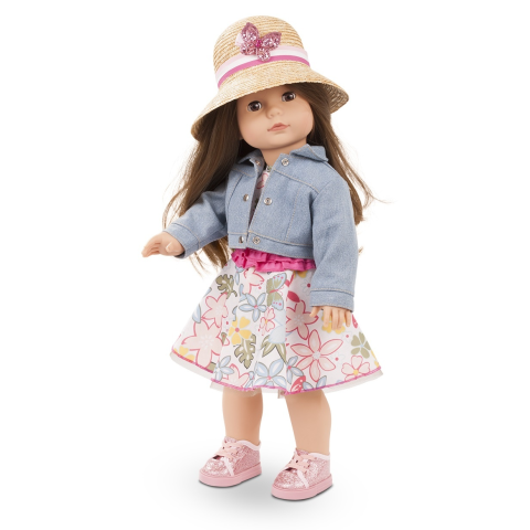Kiváló minőségű fésülhető, puhatestű Götz baba Szett tartalom: - Götz Precious Day Girl Elisabeth baba - ruha - farmerdzseki - alsó - csillámos edzőcipő - szalmakalap - hajtű