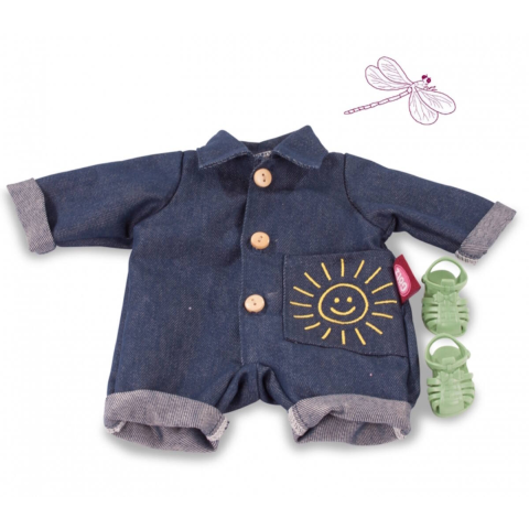 Ideje lazítani. Rövid farmer overál, nagy zsebén hímzett napcska, kényelmes nyári gumi szandállal. tökéletes játszótéri viselet.