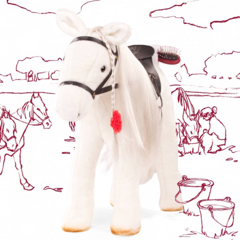 A szett tartalma: Plüss póni, nyereg, kantár, piknik takaró, kefe, tüllvirágos sörénycsipesz