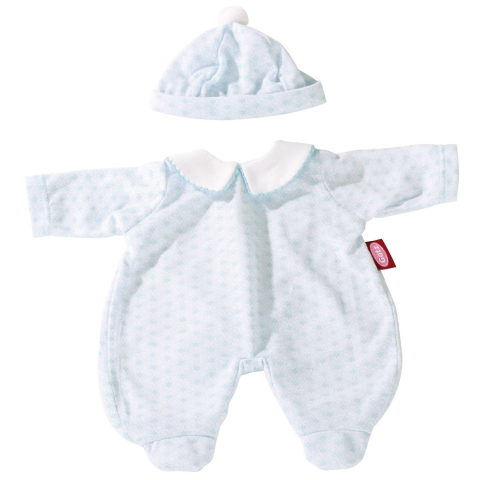 Kék babaruha sapkával, közepes méretű Götz csecsemő babákra Szett tartalom: – rugdalózó – sapka