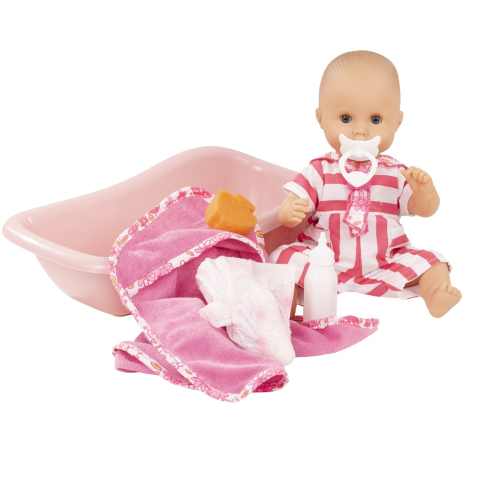 Fürdethető Götz baba Szett tartalom: - Götz Sleepy Aquini baba - nyári ruha - pelenka - fürdőkád - cumisüveg - fürdőlepedő - fürdőszivacs - cumi