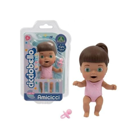 Az Amicicci babákkal minden nap játékkal és vidámsággal telik majd!Az alvásidő játékszett egy pizsamás kisbabát és egy cumit is tartalmaz, így a lányok eljátszhatják az esti altatást és a hozzá tartozó rutint. Az Amicicci babák összenyomható, puha gumiból készültek, így valósághű érzetet keltenek megjelenésükkel. Csomagolás mérete: kb. 11 x 18 x 2 cm
