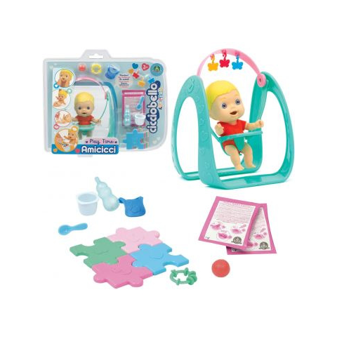 Amicicci babával minden nap játékkal és vidámsággal telik majd!Ez a kis játékszett egy csörgőkkel díszített hintát, puzzle játszószőnyeget, cumisüveget, tényért, kanalat, előkét és más apró kiegészítőket tartalmaz. Mindent, ami egy pici baba gondozásához szükséges. A lányok eljátszhatják, hogy a mókázással töltött délelőtt után megetetik Amicicci babát az összekeverhető étellel. Csomagolás mérete: kb. 29 x 23 x 12 cm