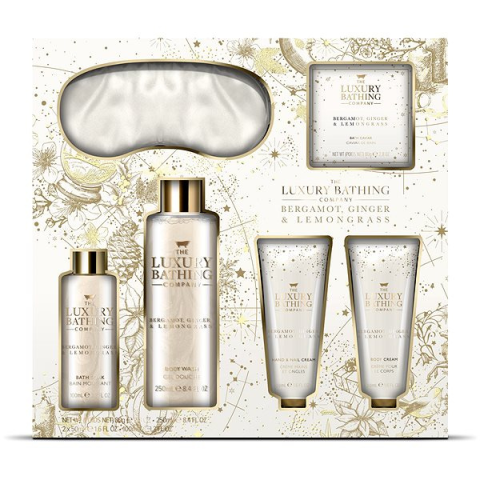 Kozmetikai ajándékcsomag - 250 ml folyékony szappant, 50 ml testápoló krémet, 50 ml kézkrémet, 100 ml habfürdőt, 80 g fürdőgyöngyöt és a nyugodt alvást elősegítő szemmaszkot tartalmaz A gyönyörű GRACE COLE 6 részes testápoló ajándékcsomag kényezteti a bőröd a mindennapi fürdőrituálé során. Az exkluzív kollekció lédús bergamott, citromfű és meleg gyömbér illatával, virágos és pézsma