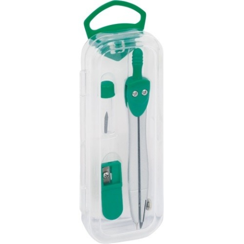 Fém iskolai körző, heggyel, és hegyezővel, formatervezett dobozban, vegyes színekben.