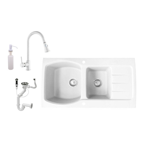 Másfél medencés gránit mosogató fehér színben. Ez a modell egyesíti a praktikumot a stílusos megjelenéssel. Nagy medencéinek köszönhetően kényelmes mosogatást tesz lehetővé. Egyik különlegessége az átlag feletti méretű gyümölcsmosó rész. A két medence leh