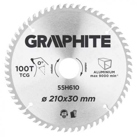 A vídiabetétes fűrésztárcsa GRAPHITE (kat. sz. 55H610) átmérővel 210 mm a hőmérsékletnek és a deformálódásnak igen ellenálló MN65-ös mangán acélötvözetből készül. Az YG6A vídia betétes fogazás vágás alumínium. A csomagolásban megtalálható szűkítő gyűrűk
