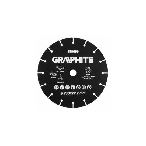 0 Vágótárcsa GRAPHITE (cikkszám: 55H699) külső átmérő 230 mm és belső 22.2 mm. A korong széleit volfrám-karbid borítja, ennek köszönhetően nagyon jól vágja puha anyagokat, többek között: fa, fatáblák, forgácslapok, tégla, műanyag, gipszkarton. Sarokcsi