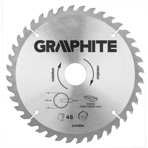 A GRAPHITE keményfém lapkás fűrésztárcsa a hőmérsékletnek és a deformálódásnak igen ellenálló MN65-ös mangán acélötvözetből készül. Az YG6A keményfém lapkás (vídiabetétes) fogazás lehetővé teszi a fa és fa alapú anyagok, mint pl. a rétegelt lemez, a forgá