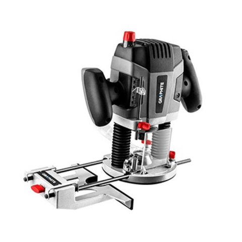 Felső orsós marógép1300W, 6, 8, 12 mm befogó, fordulatszám 11000-28000 min⁻¹, (LxH) 290 x 280 mm, tömege 3,5 kg, test lökethossz 55 mm, tartozékok: 3 db szorító hüvely, vezető hüvely a sablon szerinti másoláshoz, körívmaró feltét, porelszívó adapter szűk