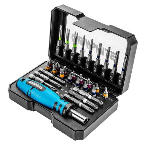 Graphite Praktikus szerviz bit készlet (kat. sz. 56H602), csavarhúzóként használható kényelmes bit befogó. A készletben a kis háztartási gépekhez használt speciális (szerviz) bitek széles választéka. Csavarbehajtó bit készlet, 31 db, S2 acél, 25 mm-es