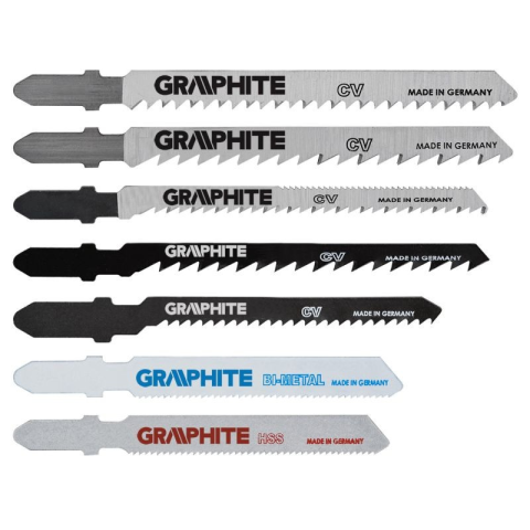 A Graphite szúrófűrészlap készletben 10 db, különféle anyagok vágására szolgáló penge található. Fa vágására 8 fűrészpenge (nagyoló, pontos, valamint íves vágáshoz), 1 penge fém vágására, 1 pedig univerzális, fához és fémhez is. Mindegyik penge népszerű T