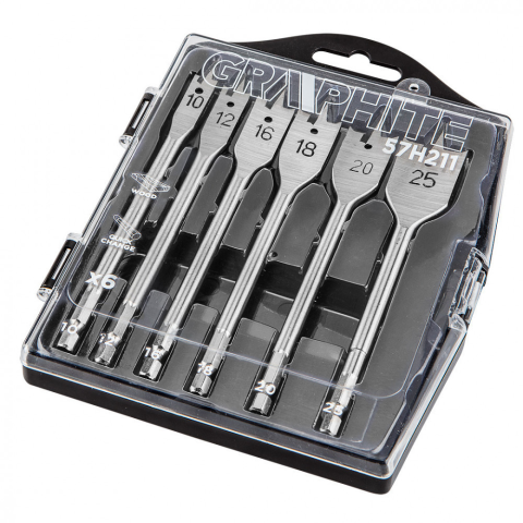 A GRAPHITE laposfúrószár készlet fához 6.0 mm és 25 mm közötti mérettartopmányban a vágóél különleges kialakításának köszönhetően lehetővé teszi a fúrási sebesség megduplázását, valamint elkerülhetővé teszi az anyag felszakítását. A „Quick Change” típusú