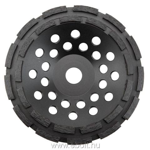 Csiszoló gyémánttárcsa, 5 mm magas dupla szegmens A GRAPHITE gyémánt csiszolótárcsa, ásványi anyag (beton, gránit, márvány...) alapú felületek csiszolására szolgál. A dupla szegmenssel hatékonyan végezhető az ásványi felületek nagyoló csiszolása. A tár