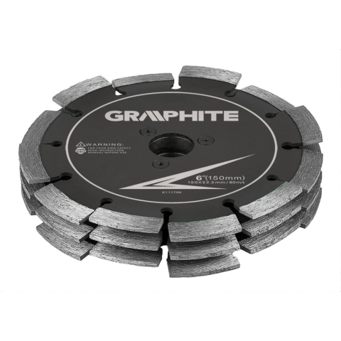 GRAPHITE gyémántvágókorong, összetett, hármas tárcsával. Termékjellemzők:Átmérő: 150 mm,Furat átmérője: 22,2 mm, Horonyszélesség: 30 mm,Maximális fordulatszám: 10,200 rpm, Kompatibilis eszköz: GRAPHITE falhoronymaró, 3 tárcsás, 150 mm (59G371), Ez a gyémá