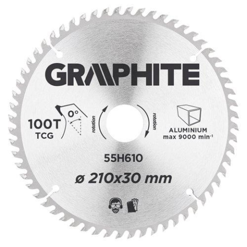 A vídiabetétes fűrésztárcsa Graphite (kat. sz. 55H610) átmérővel 210 mm a hőmérsékletnek és a deformálódásnak igen ellenálló MN65-ös mangán acélötvözetből készül. Az YG6A vídia betétes fogazás vágás alumínium. A csomagolásban megtalálható szűkítő gyűrűk