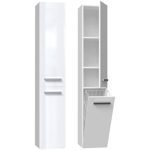 Fürdőszoba szekrény praktikus kosárral és polcokkal - 174x31x30 cm Ez a modern, minimalista dizájnú fürdőszoba szekrény tökéletes megoldás a fürdőszobai rendrakodásra. A fényes fehér frontoldal elegáns megjelenést kölcsönöz, míg a praktikus kialakítá...