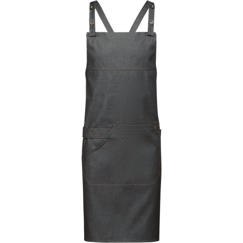 GREIFF antracit kötény denim hatású megjelenéssel, méretei 77 x 85 cm. Állítható pánttal, rávarrt zsebbel és konyharuha akasztóhurokkal rendelkezik. 52% pamutból, 3% elasztolefinból és 45% poliészterből készült, 240 g/m² anyagsűrűséggel. Univerzális méret.