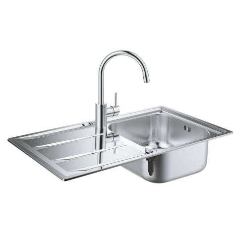 az alábbiakból áll: K400 rozsdamentesacél mosogatótálca csepegtetővel (31 566 SD0) Concetto egykaros mosogatócsaptelep (32 663 003) magas kifolyó Egylyukas kivitel GROHE StarLight króm felület GROHE SilkMove 35 mm-es kerámiabetét kihúzható gyöngyöztető á