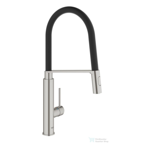 Grohe Supersteel egylyukas kivitel GROHE StarLight felület GROHE SilkMove 28 mm-es kerámiabetét gyöngyöztető with integrated temperature limiter profi zuhanyfejjel GROHFlexx rugalmas, higiénikus konyhai szantoprén tömlővel Váltás: lamináris spray / SpeedC