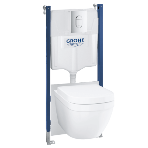 A Grohe Solido 5in1 komplett szett Grohe falsík mögötti WC tartályt és Grohe Arena króm nyomólapot tartalmaz, valamint Grohe Euro kerámia fali WC-t egyedülálló triple vortex öblítéssel (három ponton folyik be a víz a kerámiába, örvényt okozva, így téve alaposabbá és halkabbá az öblítést), Grohe Euro kerámia lecsapódásgátlós duroplaszt WC ülőkével és hangszigeteléssel. 5 év gyártói garancia, elegáns megjelenés, kimagasló Grohe minőség.
