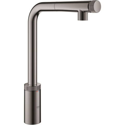 Egylyukas kivitel GROHE StarLight felületkezelés kihúzható zuhanyfej lamináris vízsugárral fém zuhanyfej GROHE Magnetic Docking garantálja a zuhanyfej könnyű visszahúzódását és zökkenőmentes dokkolását a kiindulási helyzetbe GROHE SmartControl nyomja me