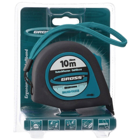 GROSS 10mx25mm professional mágneses mérőszalag gumis akasztóvég barkácsolás, csiszolás, rögzítés árgrafikon