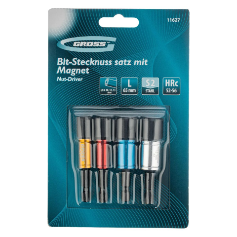 A 11627 4 db 1/4-es profi Gross Nut-Driver dugós bitek készlete 4db hatlapfejû foglalatot tartalmaz csavarozókkal való használatra. A készlet csavarokkal, és hatlapú önmetszõ tetõfedõ csavarokkal történõ szerelési munkákhoz készült. A fejek ellenállnak
