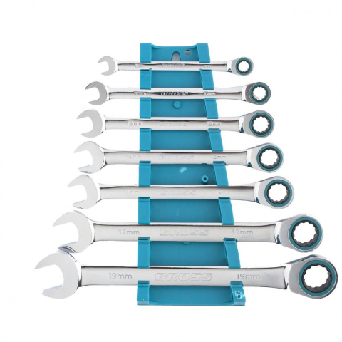 A Gross 14890 racsnis kombinált csavarkulcs-készlet csavarok és anyák felszerelésére és szétszerelésére szolgál, és 7 szerszámot tartalmaz 8 és 19 mm közötti méretben, CrV acélból. A fogságban lévõ fej 12 oldalas profillal rendelkezik, így megbízhatóan