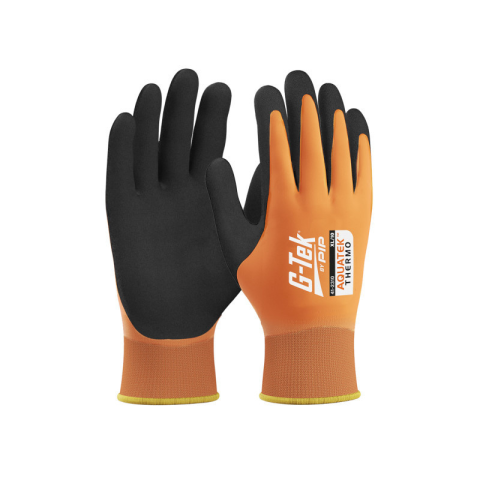 G-TEK Aquatek THERMO munkavédelmi kesztyű – Vízálló védelem hidegbenA G-TEK Aquatek THERMO munkavédelmi kesztyű dupla latex bevonattal és meleg akril/poliészter béléssel készült, amely ideális hideg és nedves munkakörnyezethez.Főbb jellemzők:Bevonat: teljes kézborítású, folyadéktaszító latex + habos latex tenyérmártás – kiváló vízállóság és tapadásBélés: meleg akril/poliészter – hőszigetelés hidegbenKialakítás: varratmentes szerkezet és zárt ma