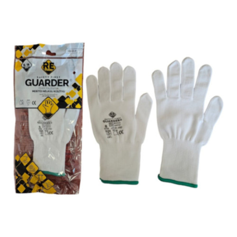 Guarder poliészter kesztyű, fehér színben, mártás nélkül, gumírozott mandzsettával. Körkötött 13g poliészter szálból készült, 10/XL méretben (barna jelölés). Kiszerelés: 12 pár/csomag, 240 pár/karton. Ötujjas fehér mártás nélküli kesztyű Alapanyag: Kör