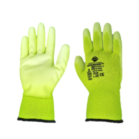 GUARDER sárga poliészter kesztyű PU tenyérmártással, ötujjas kivitelben. Könnyű, rugalmas és érintőképernyő-kompatibilis szerelőkesztyű, ideális közepes kockázati munkakörnyezethez. Kiszerelés: 12 pár/csomag, 240 pár/karton. Ötujjas sárga tenyér mártot