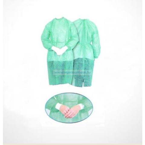 Készlettől függően KÉK vagy ZÖLD színű a termék. Anyag: polipropilén, nem szőtt textil (25 gsm) Jellemzők: körgumis mandzsetta, nyakrésznél hátul ill. derékban megköthető. Szín: zöld,kék Méret: XL (115x137cm) Min. rendelhető mennyiség: 10db (1 csomag) L