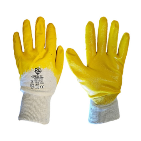 GUARDER sárga ökölcsontig nitril mártott pamutkesztyű, tartós és kényelmes védőkesztyű. 100% pamut alapanyag, 2 mm vastag nitril bevonattal az ökölcsontig. Méret: 10/XL (egy méret). Kiszerelés: 12 pár/köteg, 240 pár/karton. Ökölcsontig sárga nitril már