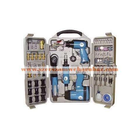 Termékleírás: Levegős készülék szett műanyag kofferben. Falra szerelhető. Hordozófogantyúval. Tartalom: 1 klt 1/2-os ütvecsavarozó készlet 1 db 3/8-os racsnics savarozó 8 db menetes dió az ütvecsavarozó és racsnis csavarozóhoz 1 db véső kalapács 4 a