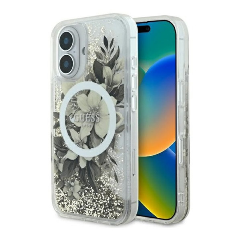 1 kép Guess Liquid Glitter Flower iPhone 16 MagSafe kemény hátlap tok, bézs GUHMP16SLFMWTE