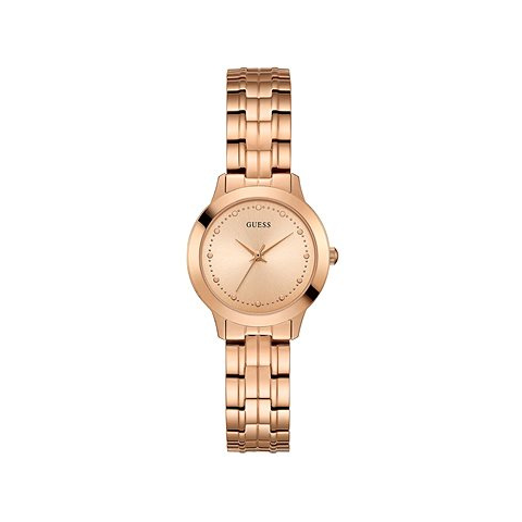 Karóra nőknek - analóg idő megjelenítés, óramű típusa quartz, kerek számlap, Guess sorozat, minimalista, számozás nélküli, ásványi számlap, 30 m (3 ATM) vízhatlanság, a tok anyaga acél, a tok színe rózsaarany, a szíj anyaga acél, a szíj színe rózsaarany A kitűnő Guess W0989L3 nőknek karóra remek választás a mindennapkora. Az alapját egy 30 mm széles kerek számlap alkotja. Az effektív Quartz technológia hosszú élettartamot és pontos mérést biztosít. A