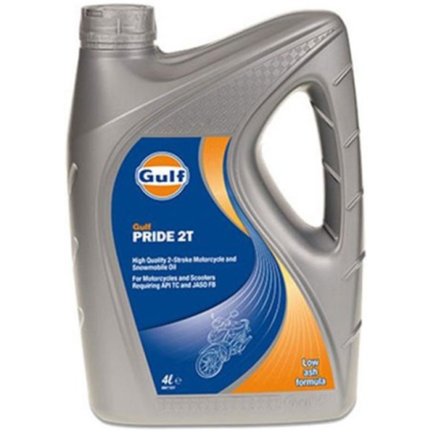 Motorolaj kétütemű motorkerékpárok számára, 4 literes kiszerelésben A Gulf Pride 2T egy kiváló minőségű kenőanyag, ami változatos alkalmazásokban használt kétütemű benzinmotorokhoz alkalmas. Kiváló minőségű bázisfolyadékokból van keverve és gondosan válogatott adalékokkal van megerősítve, hogy megfelelő motorvédelmet és tisztaságot nyújtson a kétütemű motorok számára. A Gulf Pride 2T megfelel az API TC és JASO FB nemzetközi szabványoknak. A motorker