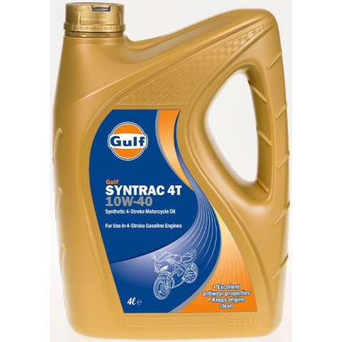 Szintetikus négyütemű motorkerékpár olaj 4 literes kiszerelésben A Gulf Syntrac 4T egy szintetikus négyütemű motorolaj, amely kifejezetten a legújabb nagyteljesítményű léghűtéses négyütemű benzinmotorokhoz lett kifejlesztve. Prémium minőségű, hidrogénkezelt bázisfolyadékok és továbbfejlesztett technológiájú adalékok keveréke, hogy túlteljesítse a modern négyütemű motorkerékpárok legnagyobb igényeket támasztó kenéstechnológiai előírásait. Kiváló