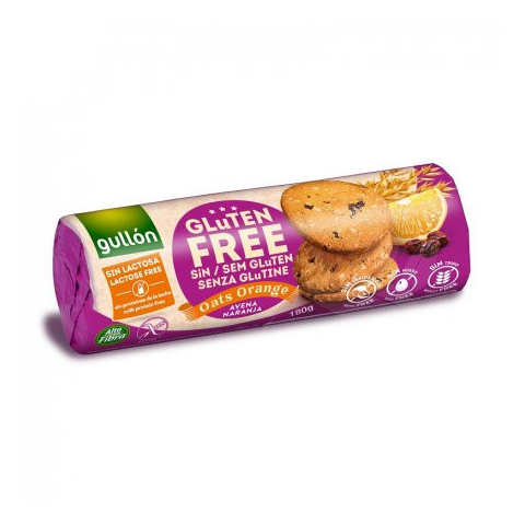 Gullón gluténmentes zabos-narancsos keksz 180 g Jellemzők: Élelmi rostban gazdag, Laktózmentes, tejfehérje mentes, Földimogyorót és dióféléket nem tartalmaz, Tojást nem tartalmaz, Búzát nem tartalmaz, Magas olajsav tartalmú napraforgó olaj Gluténment