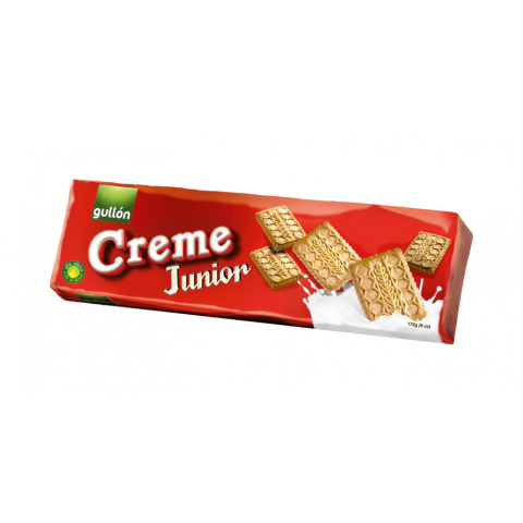 Gullon keksz creme junior 170 g A termék nyomokban szóját tartalmazhat. Száraz, hűvös, napfénytől védett helyen tárolandó. Össszetevők: Búzaliszt, cukor, magas olajsav tartalmú napraforgó étolaj 13 %, búzakeményítő, kókuszreszelék, méz, glükóz-és fru