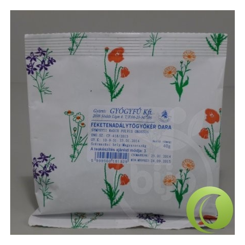 Gyógyfű feketenadálytőgyökér/dara külsőleg 40 g Külsőleg paszták, kenőcsök, pakolások formájában használják. A fekete nadálytőből készített, pépes borogatás segíti a csonttörések, húzódások, zúzódások, ficamok, rándulások gyógyulását – erre utal a növé