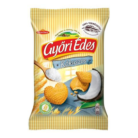 Keksz, 150 g, GYŐRI Győri édes, kókuszos A Győri Édes keksz 100%-ban természetes összetevők felhasználásával készül. Receptúrája kizárólag természetes anyagokat tartalmaz, így gondtalanul élvezheti a megszokott édes ízeket. Kiváló minőségű, aranysárg