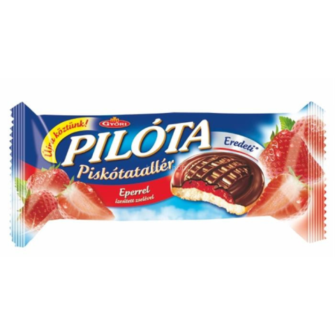 Piskótatallér, 147 g, GYŐRI Pilóta, eper Eper ízesítésű piskótatallér. Étcsokoládéba mártott gyümölcszselés tallérok. Minden nap elénk varázsolja a nyár ízeit. Nettó tömeg: 147 g