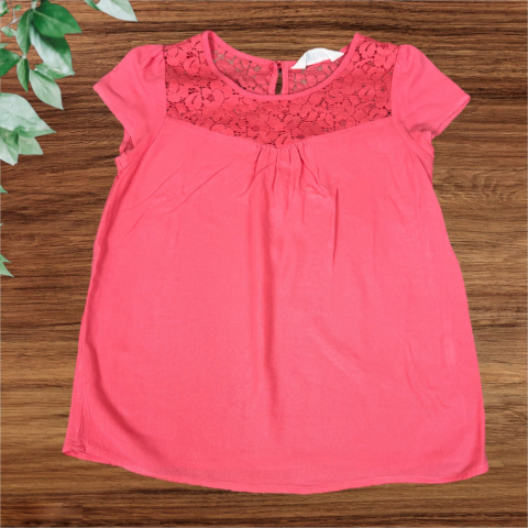 Korall színű blúz Egyenes szabású, kerek nyakkivágású, nyaknál 1 gombbal záródik. Hibátlan állapotú.