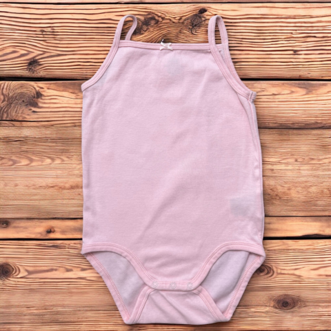 Rózsaszín, ujjatlan body Egyenes szabású, spagetti pántos, ülepnél patentos. Kellemes pmut anyag. Szép állapotú (2 pici sötétebb rózsaszín pötty van a hátán)